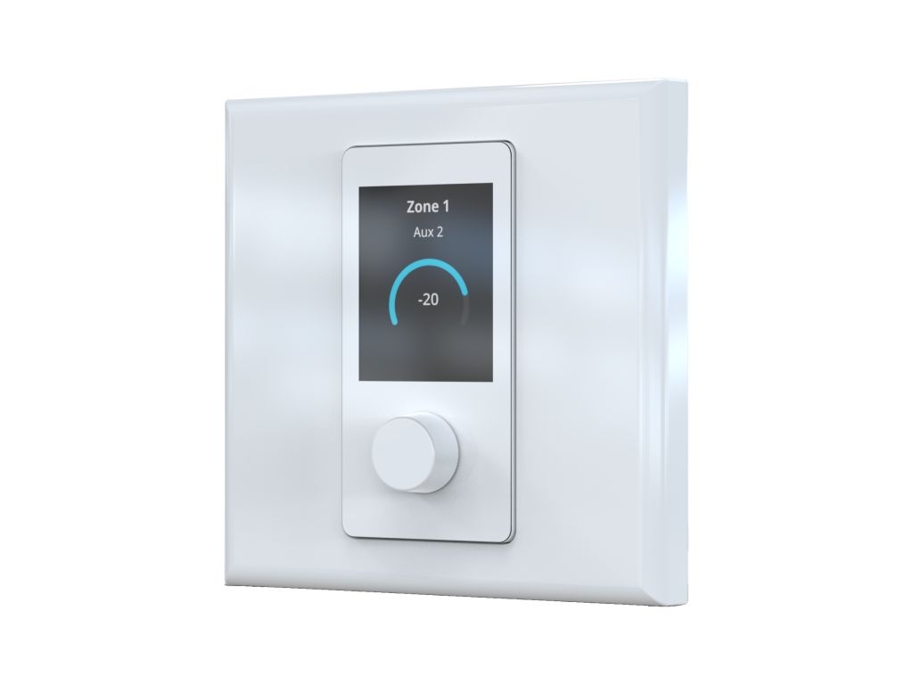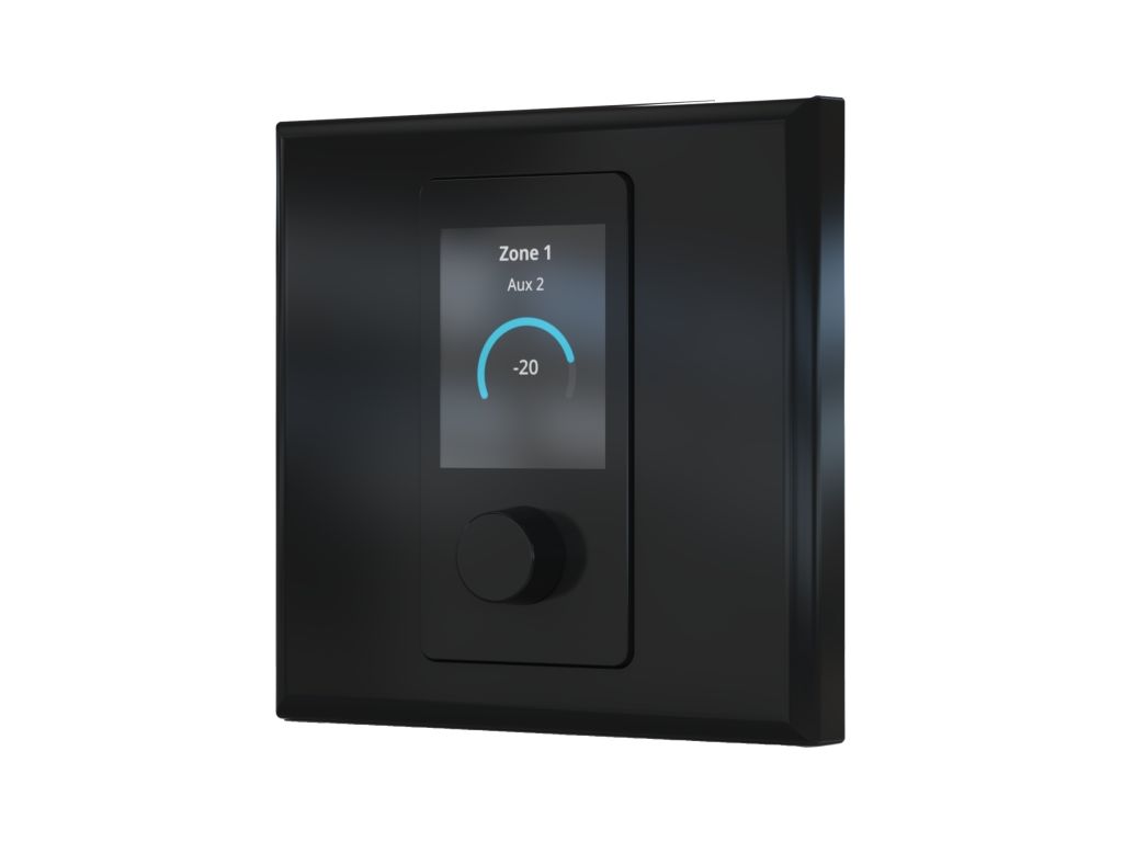 Panel je osazen otočným ovládacím enkodérem (nastavení úrovní, volby zón, volby zdrojů signálu, spouštění přehrávače), je řetězitelný za sebou (daisy chain) v max. počtu 16-ti kusů dohromady, pro obě větve. Dodáváno s černým a bílým krytem.
