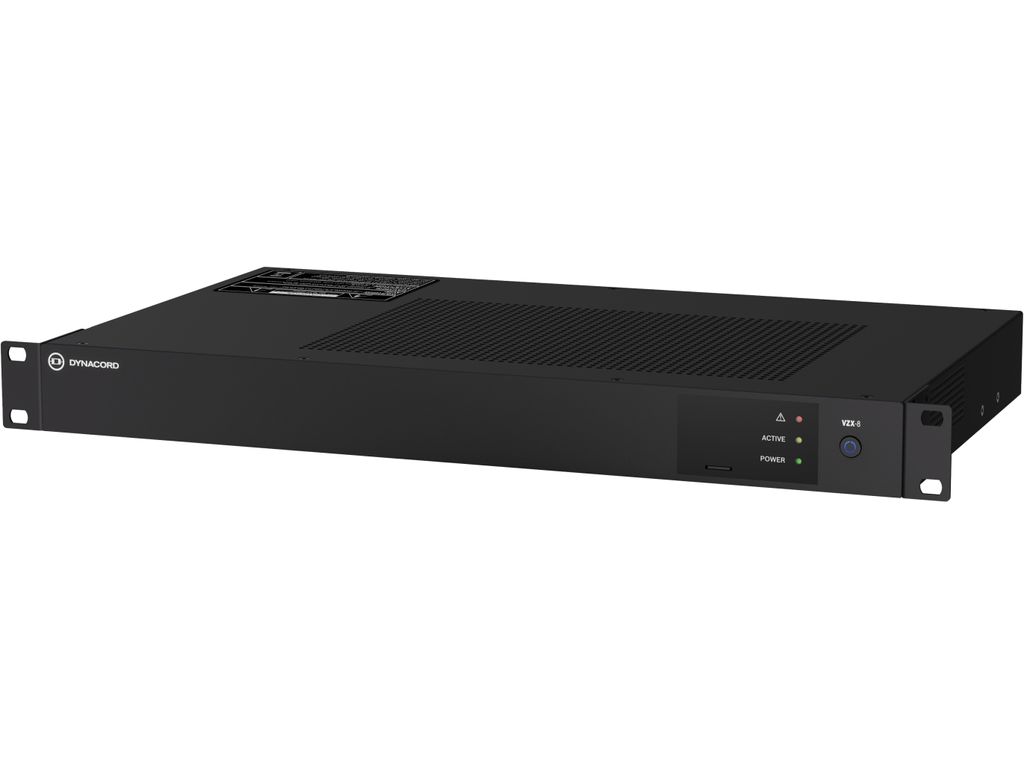 Profesionální 8-mi zónová DSP audio matice, 20 vstupů (8 mikrofonních s +48V napájením), 8x GPIO, 2x RJ45 pro připojení zesilovačů Dynacord V600, 2x RJ45 pro připojení příslušenství (call station VCS, wall panel VWP) v celkovém počtu 16.
