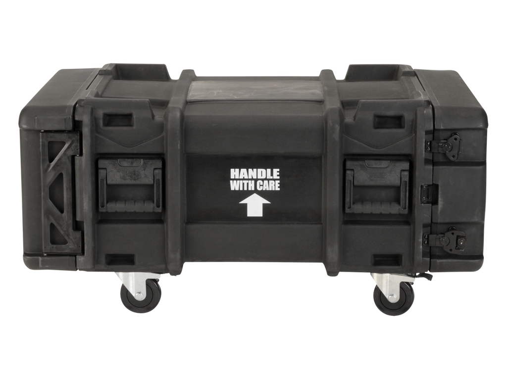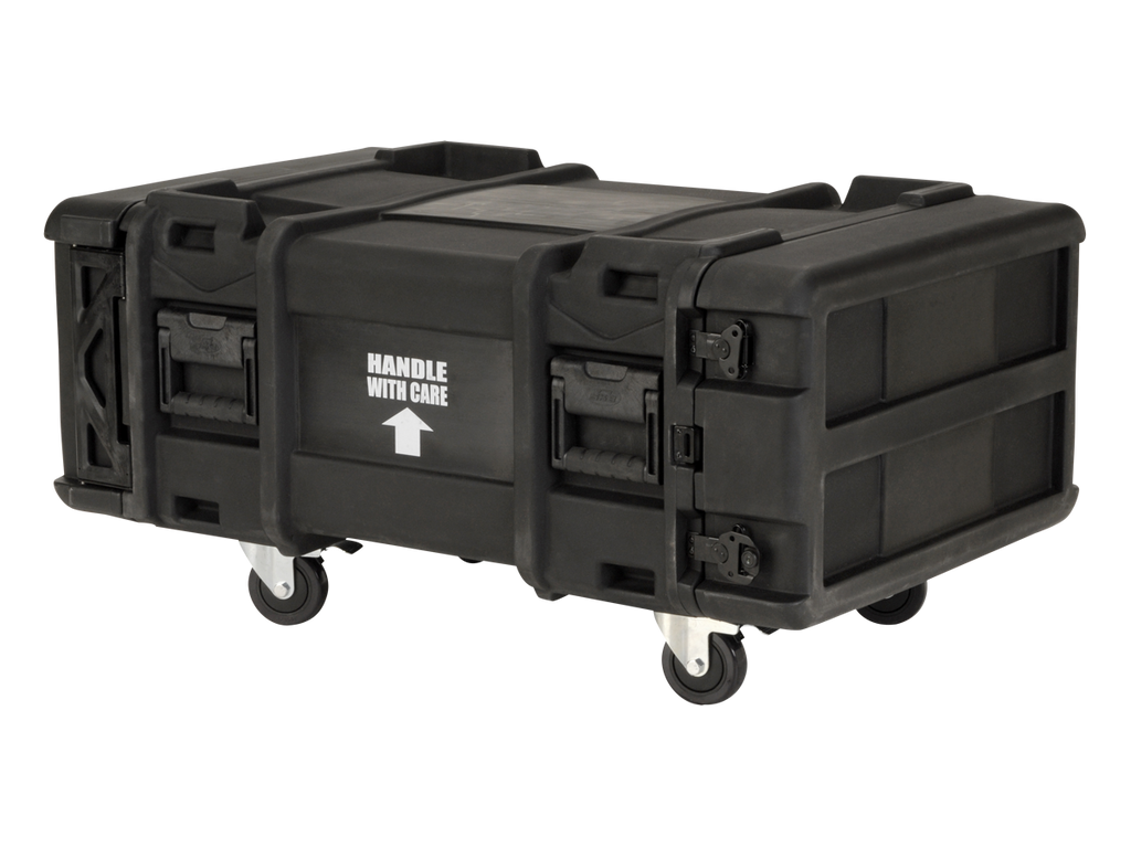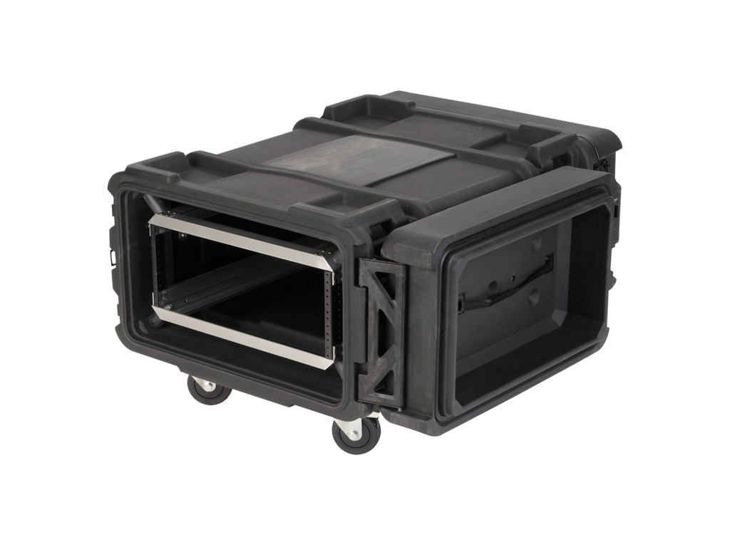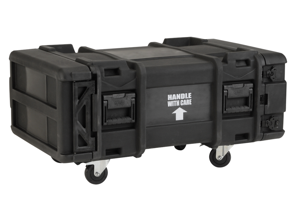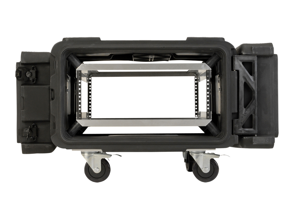 ATA vodě odolný SHOCK RACK - ultrapevný 19" široký box, výška 4U, odpružená klec 19", odnímatelné přední i zadní těsnící víko, široká boční držadla, zpevňující a aretující prolisy. Zamykatelné motýlkové zámky (přiložen klíč), rychloupínací kolečka, kovový postranní panty. Skořepina z LLDPE. Celý popis