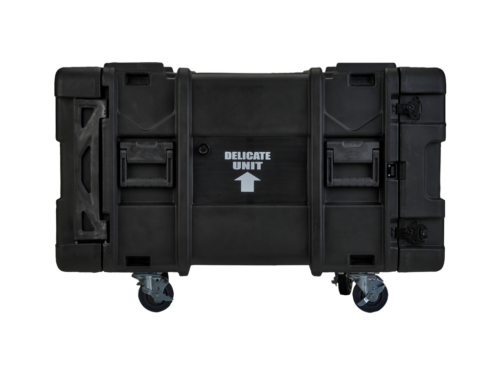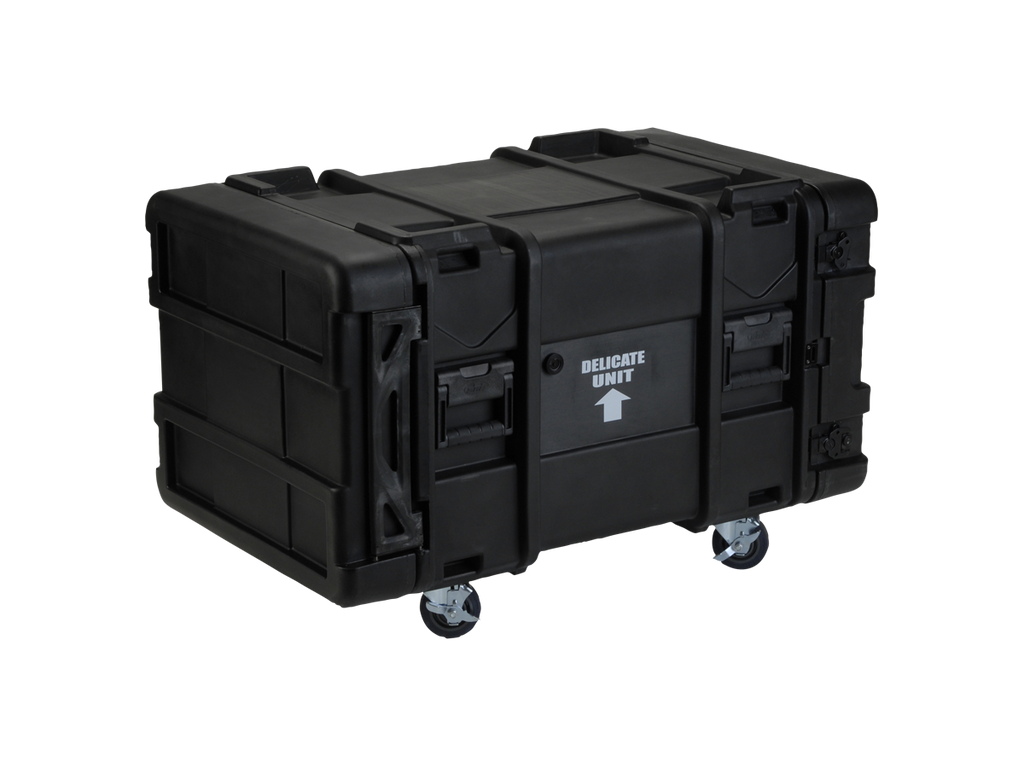 ATA vodě odolný SHOCK RACK - ultrapevný box, výška 8U, odpružená klec o světlosti 19", odnímatelné přední i zadní těsnící víko, široká boční držadla, zpevňující a aretující prolisy. Zamykatelné motýlkové zámky (přiložen klíč), rychloupínací kolečka, kovový postranní panty. Skořepina z LLDPE.