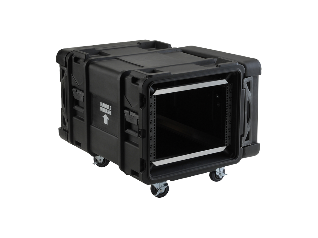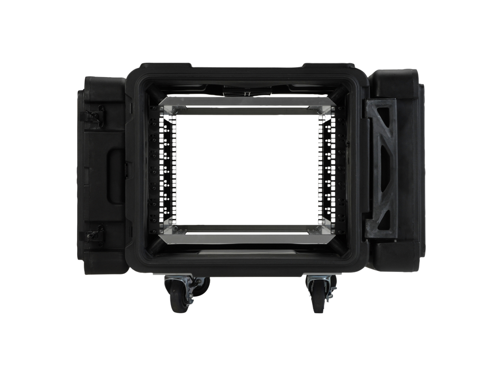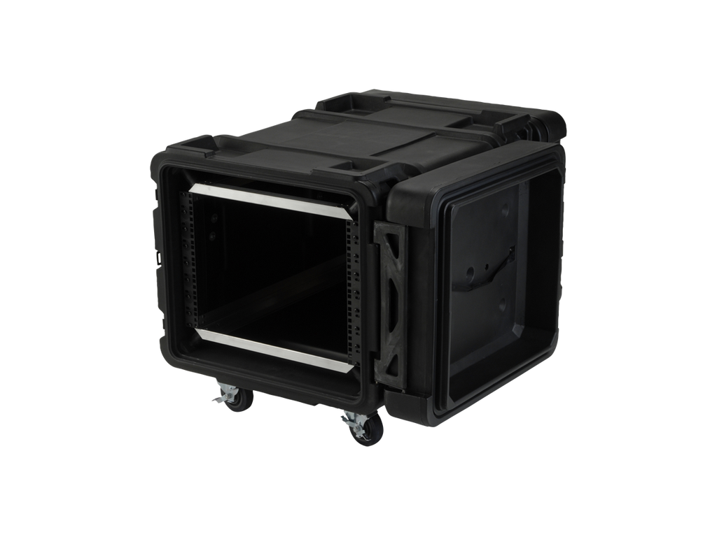 ATA vodě odolný SHOCK RACK - ultrapevný box, výška 8U, odpružená klec o světlosti 19", odnímatelné přední i zadní těsnící víko, široká boční držadla, zpevňující a aretující prolisy. Zamykatelné motýlkové zámky (přiložen klíč), rychloupínací kolečka, kovový postranní panty. Skořepina z LLDPE. Celý popis