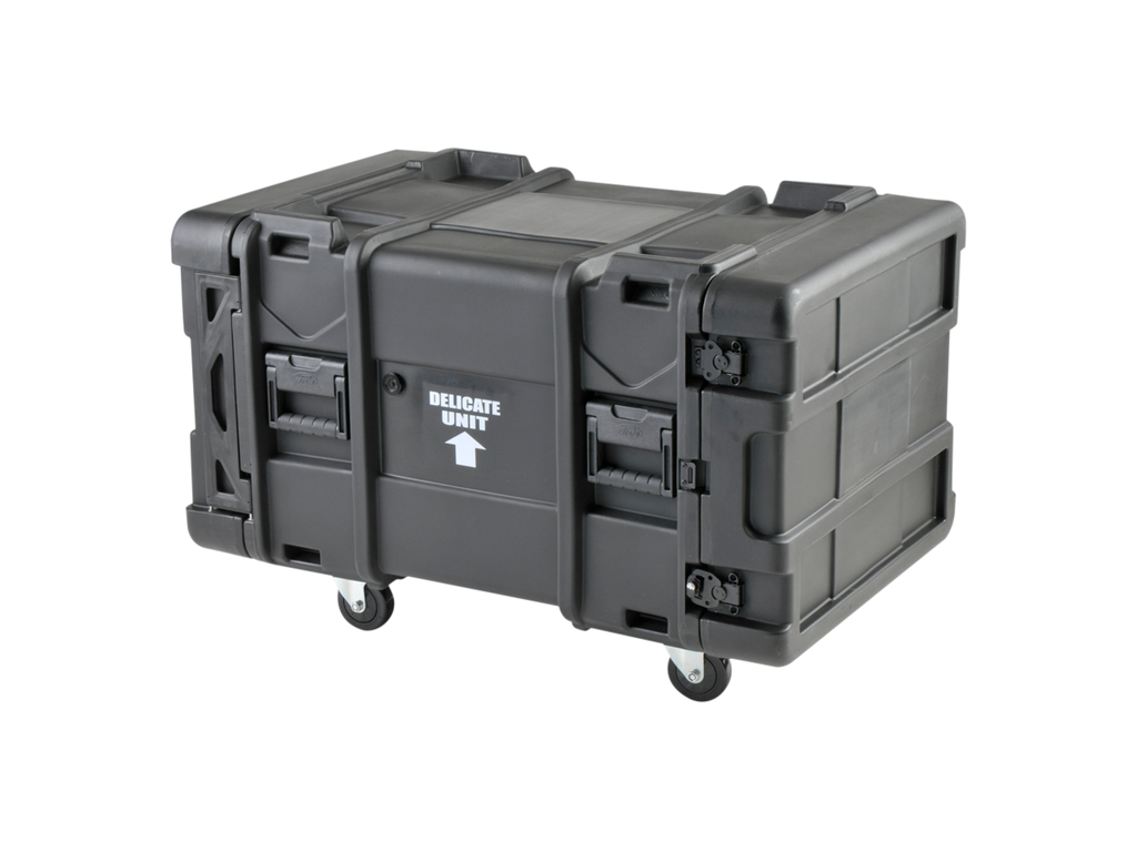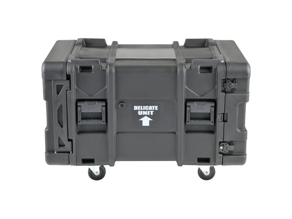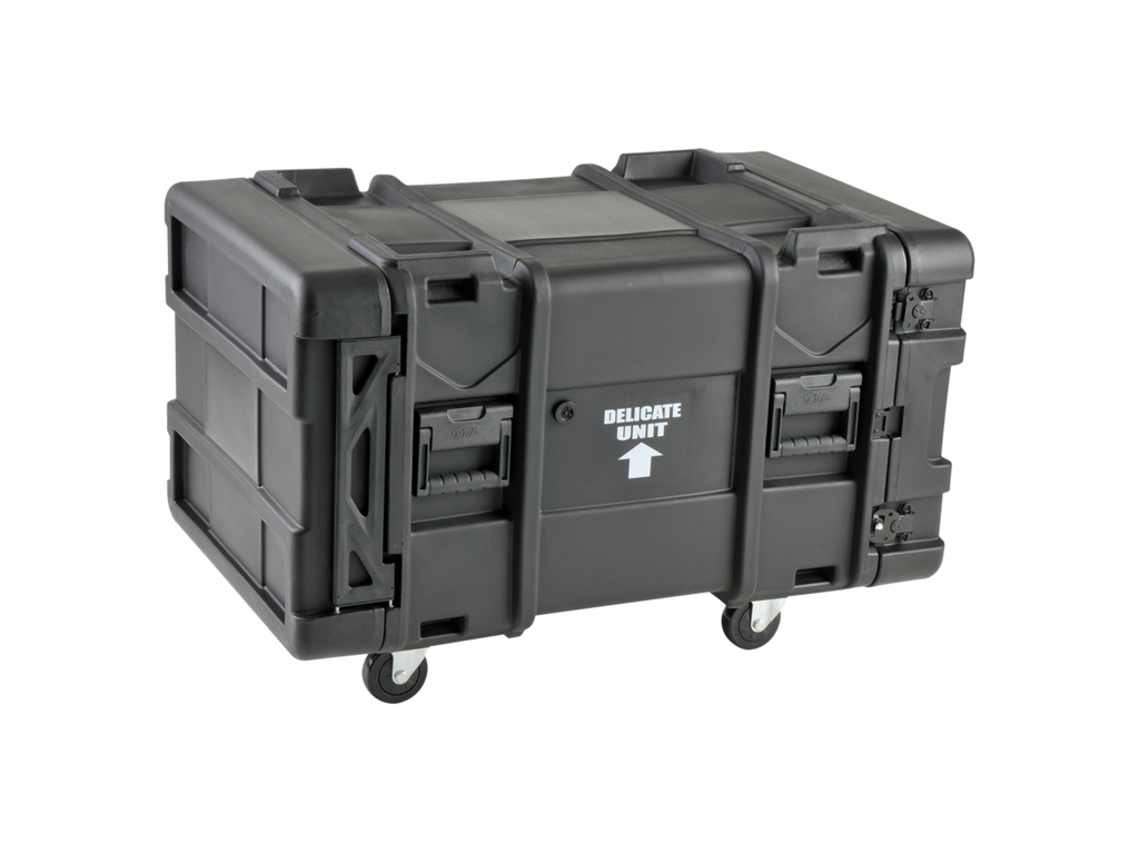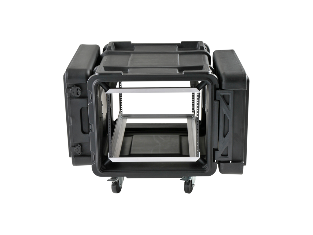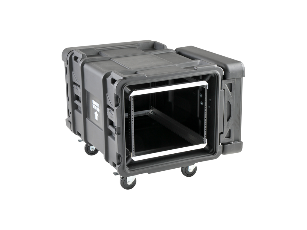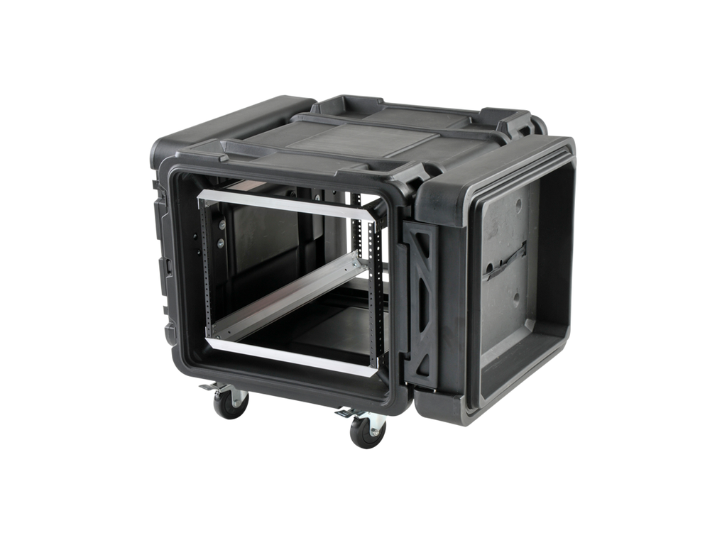 ATA vodě odolný SHOCK RACK - ultrapevný 19" široký box, výška 8U, odpružená klec 19", odnímatelné přední i zadní těsnící víko, široká boční držadla, zpevňující a aretující prolisy. Zamykatelné motýlkové zámky (přiložen klíč), rychloupínací kolečka, kovový postranní panty. Skořepina z LLDPE.